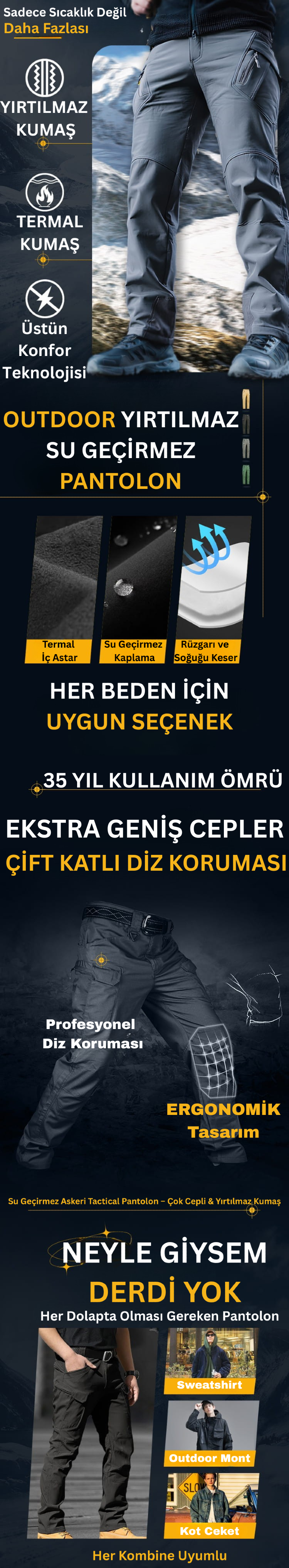 Pantolonumuz 4 mevsim kullanım için tasarlanmıştır. Termal iç katmanı sayesinde kışın sıcak tutar, nefes alabilir kumaşıyla yaz aylarında terletmez. Bahar ve sonbaharda ise rüzgar ve yağmurdan koruma sağlar.